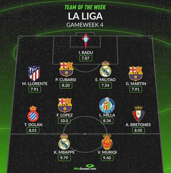 Whoscored评本轮西甲最佳阵:姆巴佩领衔,费尔明,米利唐在列 admin 2025年09月18日 05:30 63 0 直播吧9月16日讯 本轮西甲战罢,数据网站Whoscored也评出本轮西甲最佳阵,具体如下:门将:拉杜(塞尔塔)后卫:略伦特(马竞)、库巴西(巴萨)、米利唐(皇马)、马丁(巴萨)中场:多兰(西班牙人)、费尔明(巴萨)、米拉(赫塔费)、布雷通斯(奥萨苏纳)前锋:姆巴佩(皇马)、穆里奇(马洛卡) 标签: #西甲 #奥萨苏纳 #姆巴佩 #米利唐 #略伦特 #皇马 #布雷通斯 #西班牙人 #费尔明 #巴萨